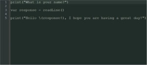 print(“Hello \(response!), I hope you are having a great day!”)